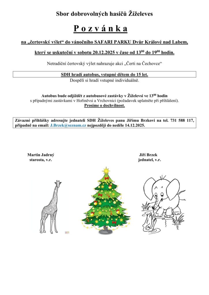 Přihlášky prosím zasílejte jednateli SDH Žíželeves, panu Jiřímu Brzkovi, na telefon 731 588 117 nebo na e-mail J.Brzek@seznam.cz, a to nejpozději do 14. 12. 2025.